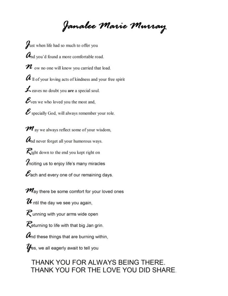 But your life isn't about my new found sorrow, An Army Sergent, Nurse, A police officer, A coroner, A trusted Friend and much much more. I fell asleep last night knowing one thing for absolute and certain , and that is ....... In the trial of good and evil we won't have to worry because l know God got to keep one very good Attorney. Thank you for showing me your unique perspective and personality. To my teacher, mentor,and sometimes playing the role when l needed the"mommly" advice. It most certainly is what we do in life. I am going to miss you,Janalee, and if l am wrong, if you didn't make it to God and got sent to the other place , you better have something fun planned for the rest of us to do when we get there. I love you ...I deeply miss you... I will see you again my Friend .